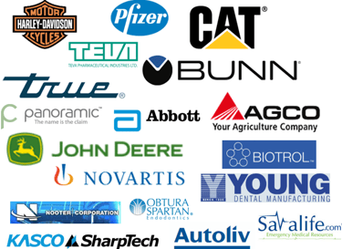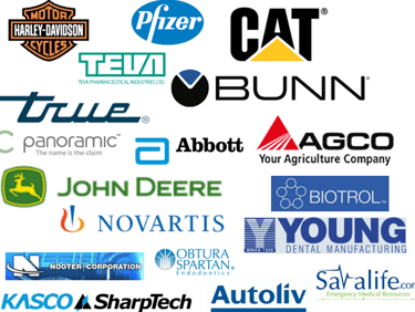 Wide range of industries including: medical devices, pharmaceutical, food/beverage, agricultural, and heavy equipment sectors. Products for: G.E., BP Oil, Dupont, Pfizer, Novartis, Abbott, Autoliv, Teva, Caterpillar, John Deere, Agco, True Manufacturing, Bunn-O-Matic, Young Dental, Biotrol, and many others.